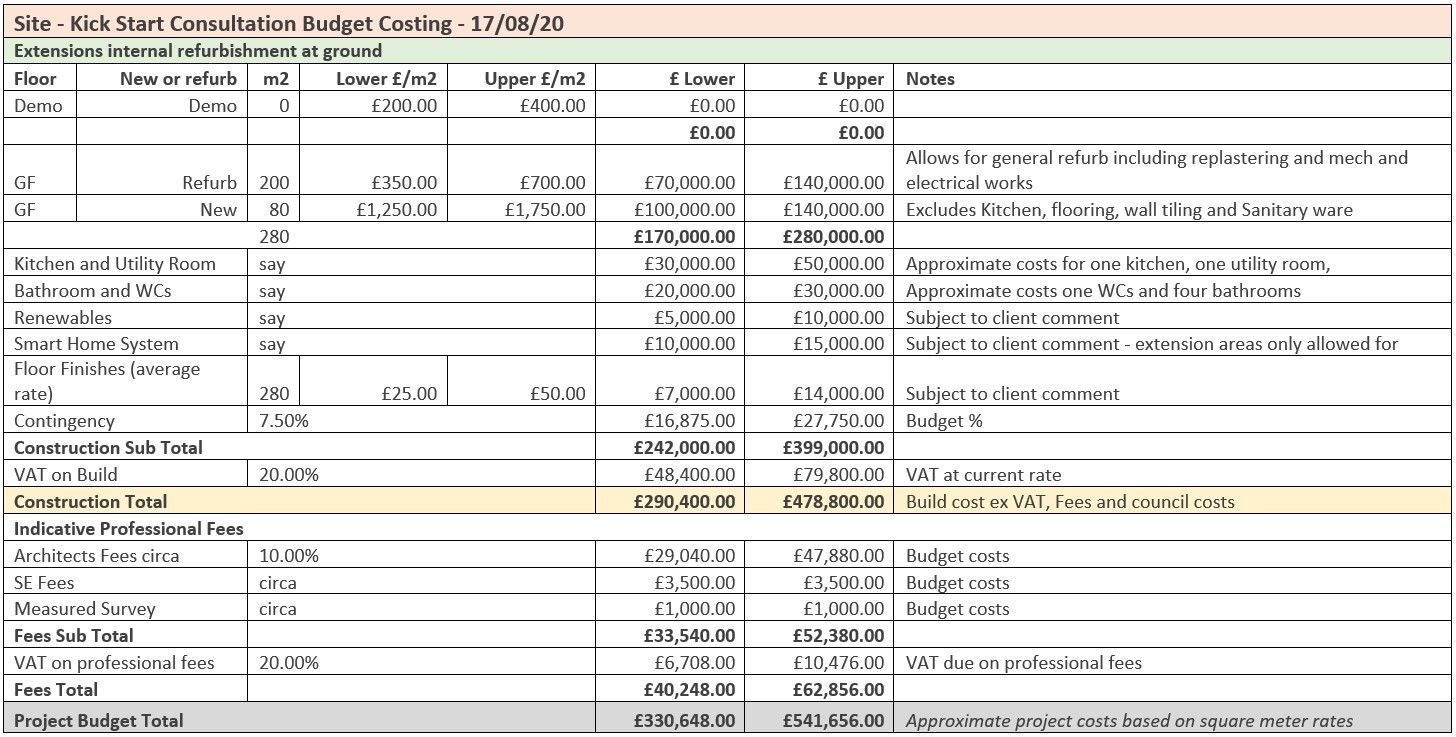 We provide a summary cost range based on current construction rates, level of finish and scope of work — plus indicative professional fees and contingency.