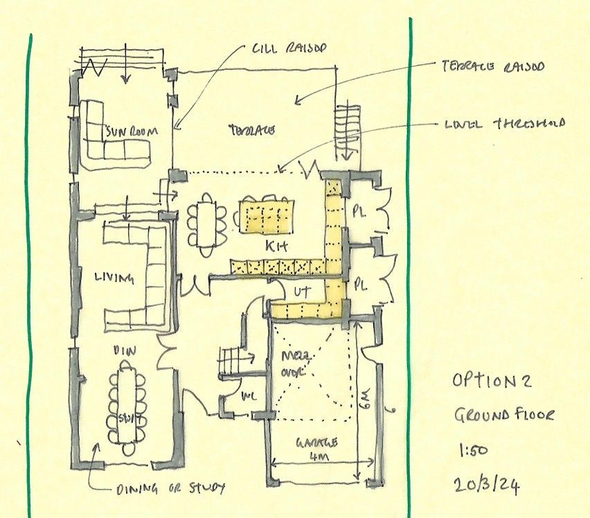 These sketches turn ideas into something tangible and help you visualise how your space might look and flow. Do bear in mind, if we’re appointed, we will prepare numerous options and develop them with you.